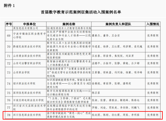 11月25日,中国教育技术协会公布“首届数字教育示范案例征集活动入围案例名单”,四川信息职业技术学院案例《基于数字赋能的“聚思·润心”思政课教学模式探索与实践》脱颖而出,入选优秀案例。