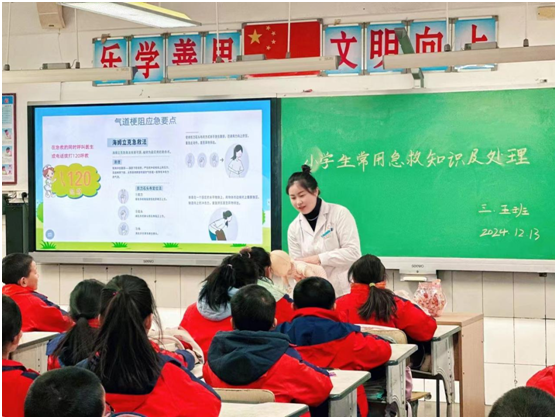 “意外随时会发生,急救知识和技能可以不用,但不能不会。”课堂上,医护人员们化身为知识的传播者和技能的教练,认真地向同学们强调自救的重要性。他们通过图片、动画、演示相结合的方式,将气道异物梗阻、烧烫伤、扭伤、鼻出血等常见意外的急救秘诀一一传授,让抽象的知识变得触手可及。