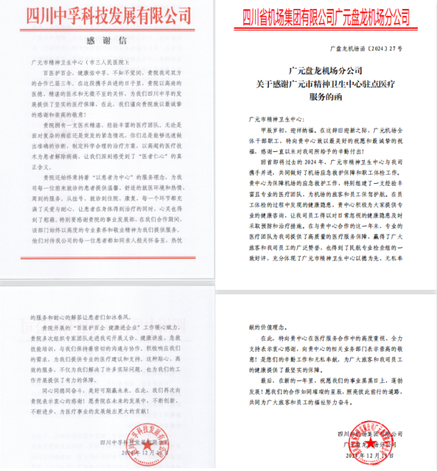 无独有偶,同一天时间,四川省机场集团有限公司广元盘龙机场分公司也将一封《关于感谢广元市第三人民医院驻点医疗服务的函》发送至该院。广元盘龙机场分公司相关负责人表示,为保障机场的应急救护工作,市第三人民医院特别组建了一支经验丰富且专业的医疗团队,为机场旅客和员工的生命健康保驾护航。