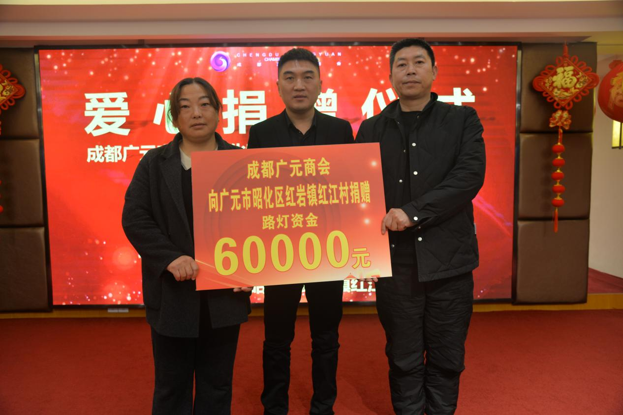 联谊会上,成都广元商会代理会长向强宗代表商会向广元市昭化区红岩镇红江村捐赠6万元的爱心资金,用于该村路灯照明设施的建设。