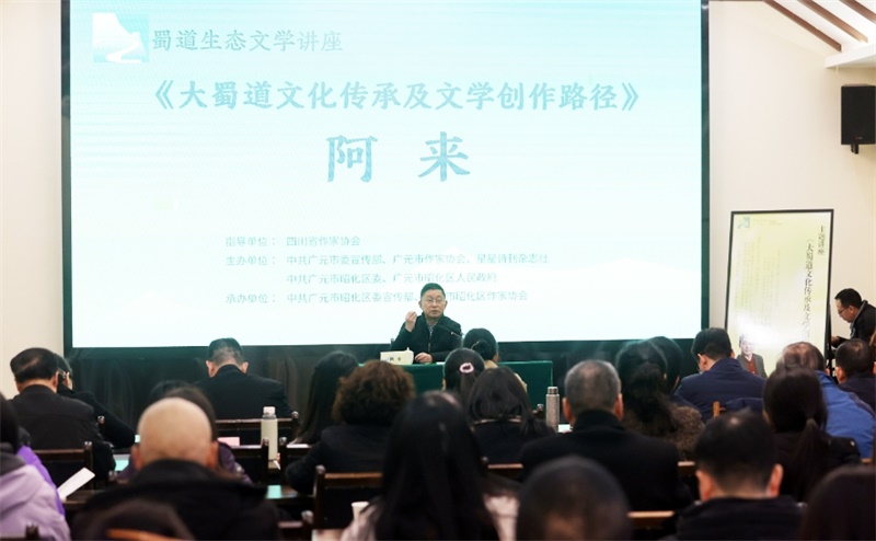 2025年2月14日,在位于“通往四川的道”的葭萌关里,四川文学史上首位获得茅盾文学奖、鲁迅文学奖的作家——阿来,以《大蜀道文化传承及文学创作路径》为主题,向首届蜀道生态文学奖颁奖与会领导嘉宾畅谈了他对蜀道文化及文学创作路径等的感受和想法。